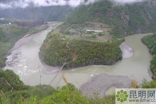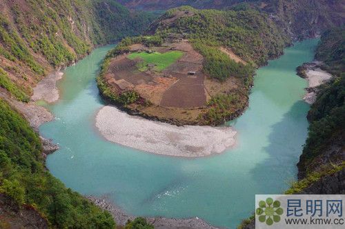 全長(zhǎng)1540公里的怒江自青藏高原穿山越谷而來(lái),在滇藏交界處的云南省貢山獨(dú)龍族怒族自治縣丙中洛附近轉(zhuǎn)了個(gè)半圓形的彎,被稱為怒江第一灣。這里的江面海拔約1700多米,氣勢(shì)磅礴,風(fēng)光旖旎,水勢(shì)緩慢,兩岸風(fēng)景獨(dú)好。東西往來(lái)的人常在此泛舟或坐溜索過(guò)江。