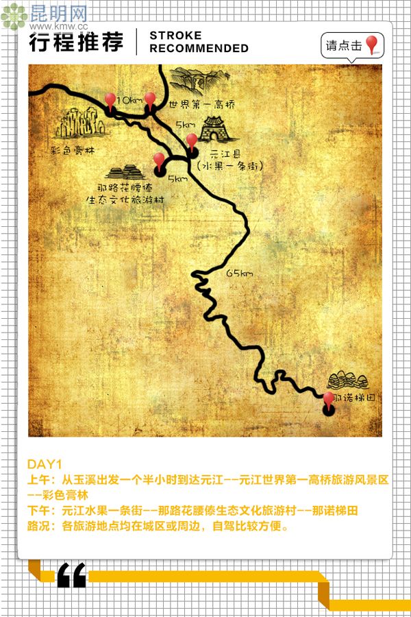 昆明到元江全程約230公里,主要經過玉溪,從石虎關立交進入昆玉、玉元高速,路況很好,注意限速標志。元江是一個哈尼族彝族傣族自治縣,是距昆明最近的熱區,盛產水果,有“紅河谷中的太陽城”的美譽。每年的金芒果節和傣喇蒙面情歌會,都給人以非凡的旅行體驗。