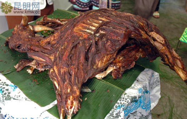 漾濞名菜,采用當(dāng)?shù)睾谏窖蚣案鞣N香料,用外烤內(nèi)蒸的方法烹制,肉質(zhì)鮮嫩,原汁原味,不燥熱。