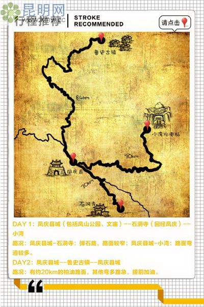 路況:鳳慶縣城-石洞寺:彈石路,路面較窄;鳳慶縣城-小灣:路面彎道較多。