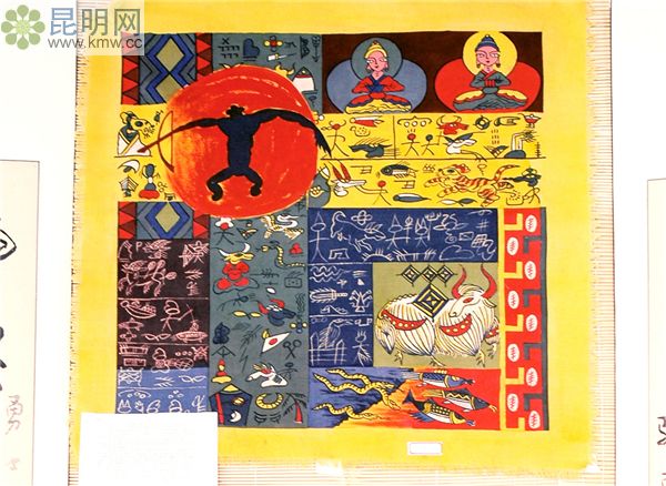 東巴掛毯采用當(dāng)?shù)貎?yōu)質(zhì)的細(xì)羊毛,精編細(xì)織而成,圖案為黑色羊毛繪制,以納西古老的東巴字畫和富有吉祥美好寓意的圖案構(gòu)成。