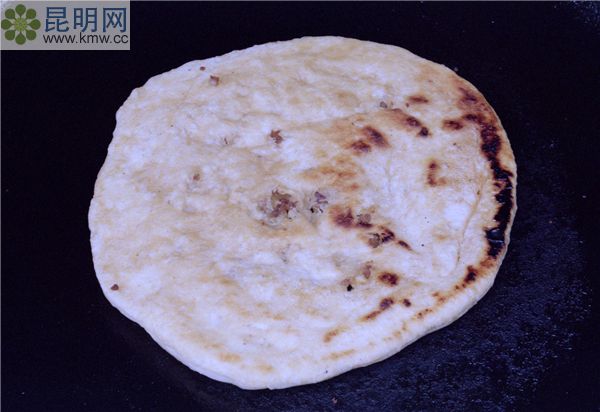 用麗江出產(chǎn)的精細(xì)麥面在大理石石板上抹搽植物油,再搟成一塊塊薄片,抹上化油,撒上火腿末或白糖后卷成圓筒狀,兩頭搭攏按扁,中間包入芝麻、核桃仁等佐料,再以平底鍋文火烤熟。