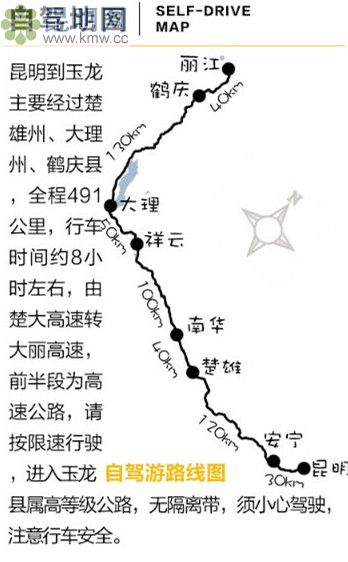 昆明到玉龍縣,約500公里,全程約8小時。途經(jīng)杭瑞高速G56——南澗路G320——214國道——大麗線S221。過路費165元。