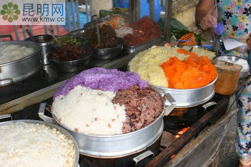染飯是先將糯米分別以不同顏色的水汁浸泡,然后再分別用木甑將染過色的糯米蒸熟。最后將各色糯飯裝在一個(gè)大簸箕內(nèi),攪拌、搭配均勻。即成五彩糯飯。彩糯飯一般為青、赤、黃、白、黑五色。而有的手巧心靈的婦女染出的花糯飯可以有七彩、八彩之多。五彩糯飯,顏色特別鮮艷,香氣特別濃烈,味道特別鮮美。