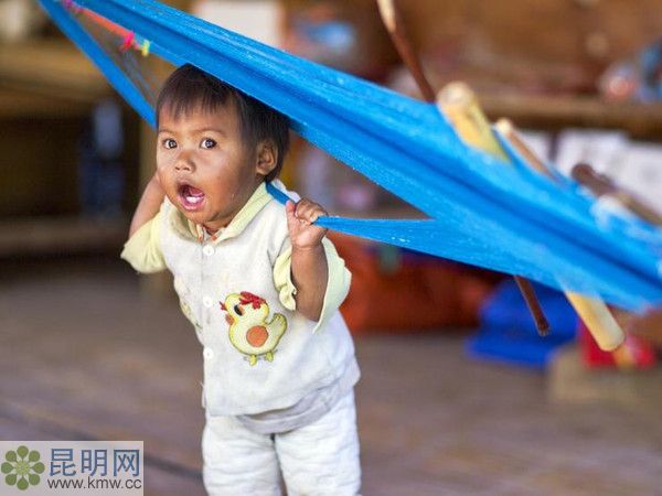 佤族人民黝黑的膚色是他們的特點,孩子也不例外,瞧瞧這位小阿哥的膚色就知道他是阿佤人民的后代了。孩子一直圍著媽媽轉,媽媽正在織布沒時間理會他,孩子有點氣惱拉著媽媽的紗線不讓媽媽織布,有點小霸道。