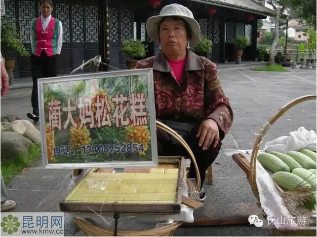和順最出名的松花糕是藺大媽做的,上過了多家電視臺,己經成為和順古鎮的一張名片,吸引著各地游客慕名而來。走進和順古鎮,只見里邊直街曲巷、石色蒼蒼,民居棟棟、暖屋靜院,小橋流水、古意渾然。游客很多,當地人照樣過著悠閑自在的農家生活,不受外界侵擾。也有擺放的地攤,也有兜售的小商。外人尋覓藺大媽的糕,門口沒有。就在洗衣這邊,買松花糕的有好幾個呢,很多人走到跟前也不知道。問人,找到目標,小推車鋪面就在龍潭邊上,大媽笑吟呤地站在那里。那松花糕長得很可愛,方方正正、蛋黃色的一塊塊,精致小巧,讓人舍不得一口吞掉;新鮮的松花糕很軟,含一口在嘴里,溫潤香軟的身子于唇間悄然溶化,微微的松子香、淺淺的清甜味,一如滿溢的愛戀沁出唇邊,久久不散……松花糕具有果仁風味,清甜、油潤、入口易化、不粘牙、不糊口。吃完松花糕,嘴唇上方往往都會留下半圈蛋黃色粉末,伸出舌頭輕舔,恍如隔世般的再度回味。下次再來——只是下次不知要等到什么時候,松花糕就給你留下了長久的念想。