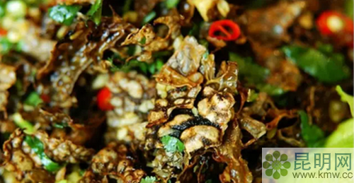 此青蛙皮非彼青蛙皮,只是一種看起來很像青蛙皮的植物。這種云南原始森林喬木中的苔蘚類植被,由于長相酷似青蛙皮,又像蝴蝶翅膀的脈絡,故云南人稱“青蛙皮”、“樹蝴蝶”。乍看起來是一大盤青蛙皮狀的東西,上面是翠綠色的花紋,吃起來又酸又辣,第一次品嘗的人可能有點不習慣,但它的口感非常特別,是一種非常舒展的香脆,有股很特別的香,嚼得越久,香味越持久。是白族人喜愛的一道天然綠色食品。