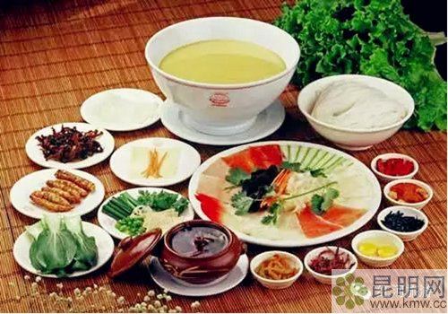 進餐時,以大"海參碗"盛湯,加味精、胡菽、熟雞油。湯滾油厚,不冒一絲熱氣。湯上桌后,將鴿蛋磕入碗內,繼而將肉片氽入湯中,輕輕一攪,霎時變得雪白、細嫩。然后再放入鮮菜、米線,配上辣椒油、芝麻油等,便可食用。米線品種甚多,吃法多樣,既可熱吃,也可涼吃,可葷可素,豐儉由人。