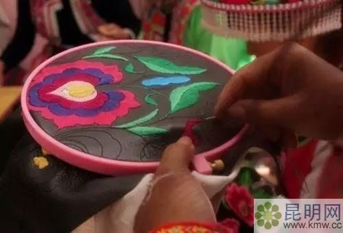 楚雄地區(qū)彝族女裝為右大襟短衣和長(zhǎng)褲,少數(shù)地區(qū)上著對(duì)襟衣,下著花裙。工藝以鑲補(bǔ)、平繡為主,圖案多為花卉。