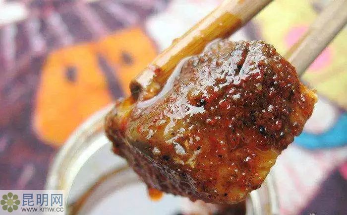 在建水紅火的夜市燒烤排擋里,少不了包漿豆腐的身影。豆腐們伏在燒烤架上,貌不驚人。幾分鐘后,包漿豆腐開始?xì)g歌了,一塊塊“噗噗”地冒著熱氣,爭先恐后地炫耀自己逐漸膨脹、一戳即破的身體,外皮也變得金黃。這時(shí)候蘸上鹵腐汁等配料,香氣便開始泛濫。