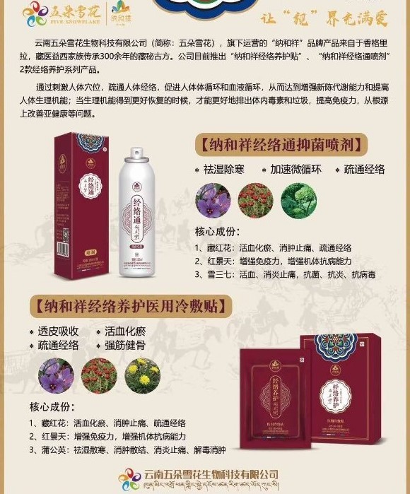 五朵雪花目前推出納和祥經(jīng)絡(luò)養(yǎng)護(hù)醫(yī)用冷敷貼、納和祥經(jīng)絡(luò)通抑菌噴劑2款產(chǎn)品。通過刺激人體穴位,疏通人體經(jīng)絡(luò),促進(jìn)身體循環(huán)和血液循環(huán),增強(qiáng)人體生理機(jī)能,排出毒素和垃圾,從根源上緩解疲勞亞健康,改善疼痛問題。