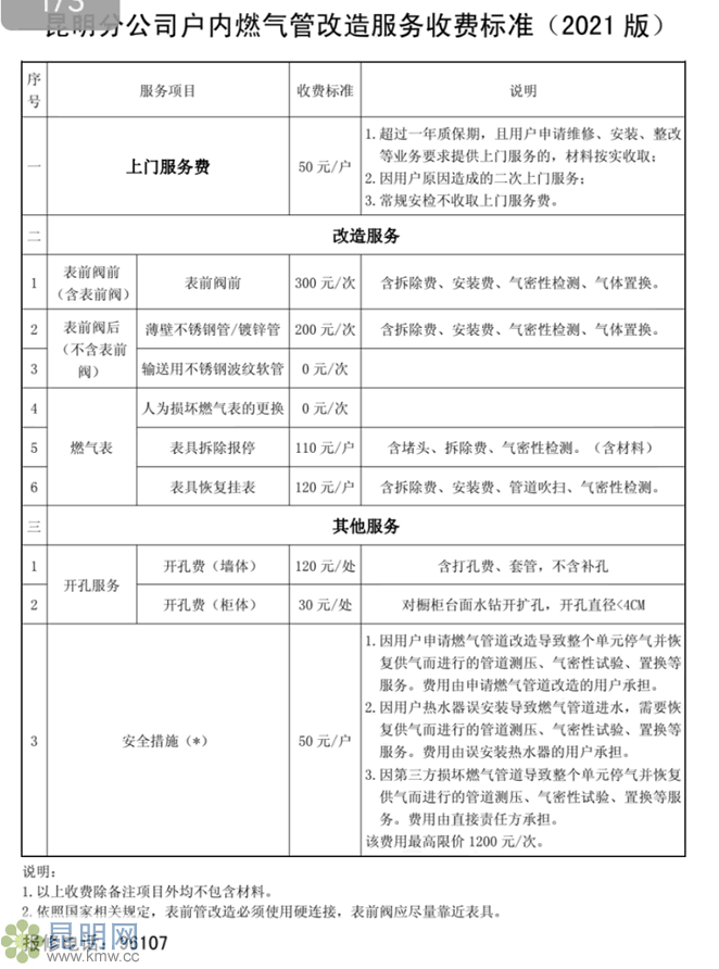| 2 | 老舊小區(qū) | 元/套 | 3800元/戶 | 《昆明市發(fā)展和改革委員會 昆明市住房和城鄉(xiāng)建設(shè)局 昆明市市場監(jiān)督管理局關(guān)于進(jìn)一步規(guī)范老舊小區(qū)燃?xì)夤こ贪惭b收費(fèi)有關(guān)問題的通知》 |